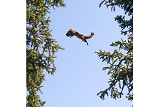 A red squirrel mother leaps while carrying a pretty big pup! Yukon, Canada.